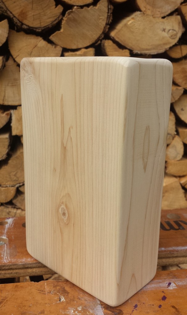 I always seem to make them in pairs, usually side-by-side cuts from the same length of White Cedar, which take the most part of a morning or afternoon to transform into yoga blocks. There’s no particular marker or step that they are “done”; it’s more intuitive, I just get to a point when they seem smooth enough and gently rounded enough and they feel “ready”. It’s one of those activities where you find yourself “in the zone”. It reminds me a bit of, as a child, how hours could go by playing with Lego.